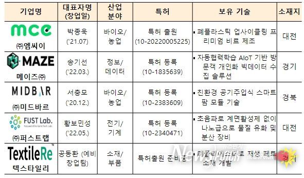 행사에는 폐플라스틱을 새활용(업사이클링해) 프리미엄 비료를 제조하는 ㈜엠씨이, 에이아이오티(AIoT) 기반의 방문객 개인화 거대자료(빅데이터) 수집 해결책을 제공하는 메이즈㈜ 외에 ㈜미드바르, ㈜퍼스트랩, 텍스타일리 등 총 5개 기업이 참가한다.