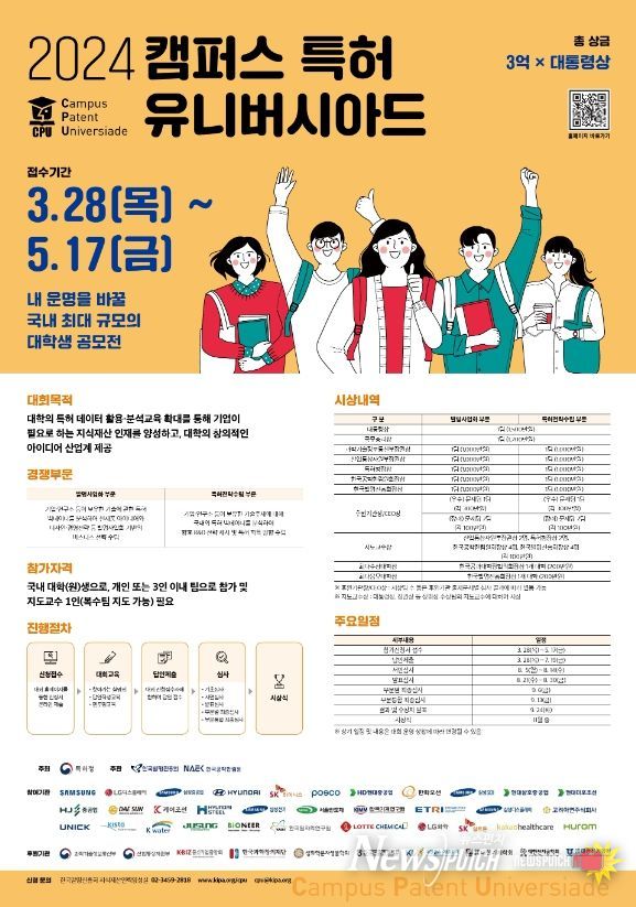 뉴스펀치 장은영 기자 | 특허청은 3월 28일부터 5월 17일까지 신기술 분야에서 미래를 주도할 특허 융합인재 발굴을 위해 「2024 캠퍼스 특허 유니버시아드」 참가자를 모집한다고 밝혔다.