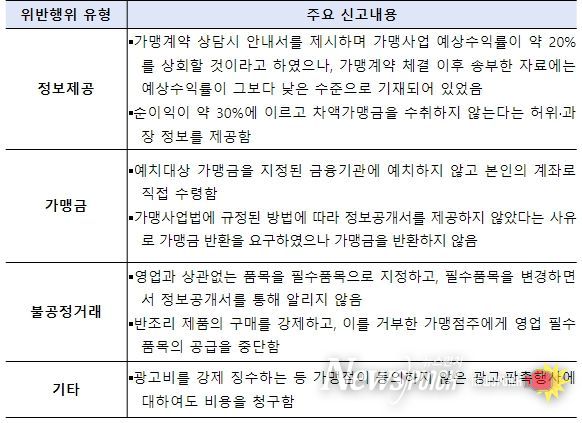 지방사무소는 4월부터 각 신고 건에 대해 필요한 경우 현장조사를 실시하는 등 집중적으로 조사를 진행할 예정이다. 특히 신고 등을 통해 많은 어려움을 호소하고 있는 ▲가맹희망자에게 정보공개서를 제공하지 않고 가맹계약을 체결하는 행위, ▲예상매출액 범위 관련 허위·과장된 정보를 제공하는 행위, ▲가맹금 예치·반환 의무 위반행위, ▲필수품목을 과도하게 지정하고 가맹본부로부터 구매할 것을 강제하는 행위, ▲다수 가맹점주 사전동의 없이 판촉행사를 실시하면서 가맹점주에게 비용을 부담시키는 행위 등을 중심으로 법위반 여부를 면밀히 살펴본 후, 법위반이 확인된 업체는 7월까지 필요한 조치(안건상정 등)를 신속히 마무리할 계획이다.