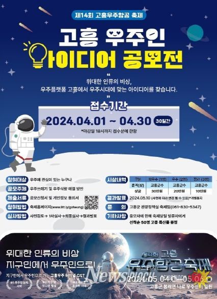 뉴스펀치 김희경 기자 | 고흥군은 오는 5월 4일부터 6일까지 3일간 나로우주센터 우주과학관 일원에서 개최하는 제14회 고흥우주항공축제의 관심을 높이고, 우주항공 중심도시 고흥의 이미지를 정립하고자 ‘고흥 우주인 아이디어 공모전’을 개최한다.
