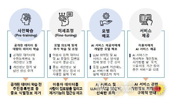 이에 대해, 개인정보위는 AI 서비스 제공 단계별 보호조치 강화를 요구하는 한편, 최소한 사전 학습단계(pre-training)에서 주요 개인식별정보 등이 제거될 수 있도록 인터넷에 우리 국민의 개인정보가 노출된 것을 탐지한 데이터(URL)를 AI 서비스 제공사업자에게 제공할 계획이다.