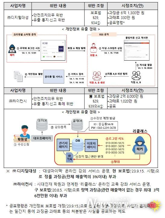 이들 2개 사업자는 인터넷 강의 사업자로, 입시를 준비하는 청소년이 주로 이용하고 있어 개인정보 유출에 각별한 주의를 기울일 필요가 있으나, 「개인정보 보호법」에 따른 안전조치와 개인정보 유출 통지 등의 의무를 위반하여 과징금과 과태료 부과 처분 등을 받게 됐다.