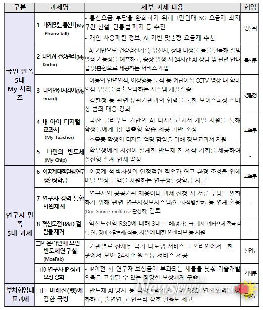 이번 회의에서는 △ 국민 체감 5대 ‘마이(My) 과제’, △ 연구자 체감 5대 과제, △ 부처 협업 대표과제 등 과학기술·디지털 분야에 확실한 변화를 가져올 수 있는 ‘과기정통부 11대 개혁과제’를 우선적으로 추진해나가기로 했다.