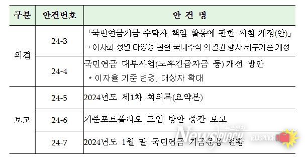 뉴스펀치 장은영 기자 | 국민연금기금운용위원회는 3월 28일에 2024년도 제2차 회의를 열어 ‘국민연금기금 수탁자 책임 활동에 관한 지침 개정(안)’과 ‘국민연금 대부사업(노후긴급자금 등) 개선 방안’을 심의·의결하고, ‘국민연금기금 기준포트폴리오 도입 방안’ 등을 논의했다.