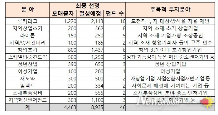이번 출자사업은 4,463억원을 출자해 46개 기금(펀드) 8,935억원 규모의 벤처기금(펀드)을 선정했다. 신속한 벤처기금(펀드) 결성과 투자금 공급을 위하여 1분기 내 선정을 완료한 것이다.