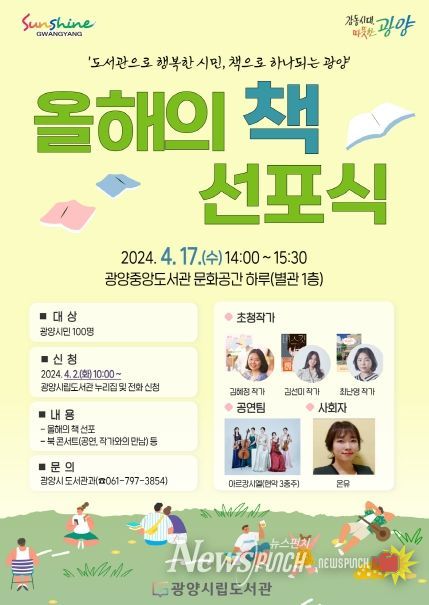 뉴스펀치 김희경 기자 | 광양시가 오는 17일 오후 2시 광양중앙도서관 문화공간 하루에서 ‘2024 광양시 올해의 책 선포식’을 시작으로 ‘시민 한 책 읽기’를 본격 추진한다.