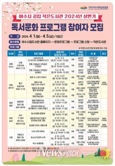 뉴스펀치 김희경 기자 | 여수시 공립 작은도서관 5개소에서 ‘2024년 상반기 독서문화 프로그램’ 참여자를 모집한다.