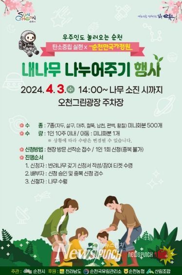 뉴스펀치 김희경 기자 | 순천시는 순천만국가정원 개장을 맞이하여 '내나무 나누어주기 행사'를 오는 3일 오천그린광장 주차장에서 개최한다고 밝혔다.