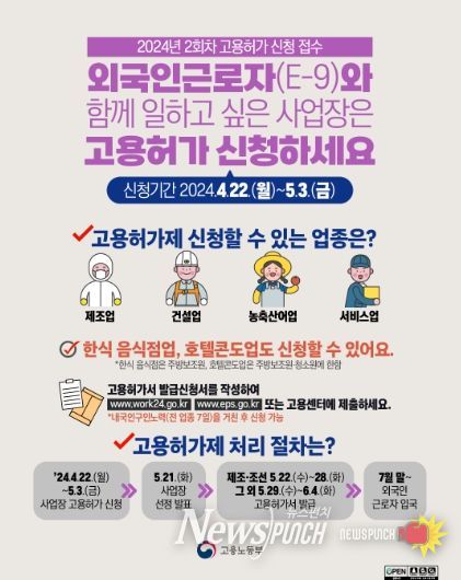 뉴스펀치 장은영 기자 | 고용노동부는 4월 22일부터 5월 3일까지 전국 지방고용노동관서를 통해 고용허가제 외국인근로자(E-9)에 대한 ’24년도 2회차 신규 고용허가 신청을 받는다.