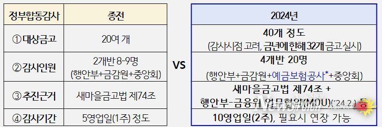 이번 합동감사는 지난 2월 행정안전부-금융위원회가 체결한 ‘새마을금고 건전성 강화 협력체계 강화를 위한 업무협약’의 후속조치로,행정안전부-금융감독원-예금보험공사-새마을금고중앙회가 협업하여 실시하는 정부합동감사로, 대상금고(20개→40개), 감사인원(8~9명→20명), 감사기간(1주, 5영업일 → 2주, 10영업일) 확대 등을 통해 지역금고에 대한 감사를 대폭 강화한다는 점에서 그 의미가 크다.