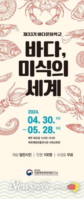 뉴스펀치 김희경 기자 | 문화재청 국립해양문화재연구소(소장 김성배)는 4월 30일부터 5월 28일까지 매주 화요일 오후 2시 목포해양유물전시관 사회교육관에서 ‘바다, 미식의 세계’를 주제로 '제33기 바다문화학교' 강좌를 진행하며, 4월 11일부터 4월 25일까지 수강생을 모집한다.