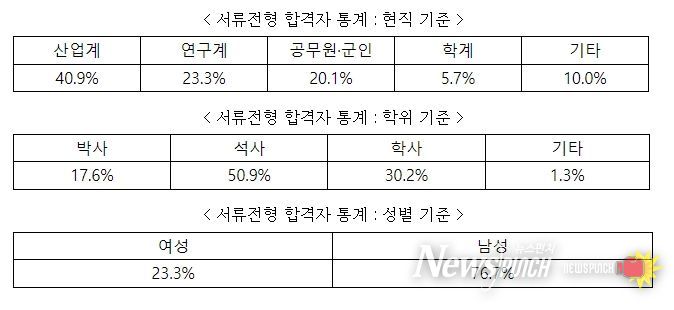 서류전형 합격자 통계를 살펴보면 산업계 40.9%, 연구계 23.3%, 공무원·군인 20.1%, 학계 5.7%, 기타 10.0%를 차지하며, 학위별로는 박사 17.6%, 석사 50.9%, 학사 30.2%, 기타 1.3% 비중을 차지하였다. 성별은 여성이 23.3%, 남성이 76.7%다.