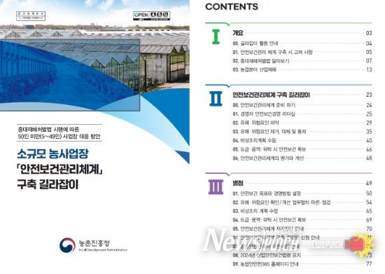안내서 ‘소규모 농사업장'안전보건관리체계'구축 길라잡이’는 소규모 농사업장에서 안전보건관리체계를 구축할 때 유용한 실용 정보를 압축해 담았다. 주요 내용으로 △중대재해처벌법 이해 △안전보건관리체계 구축 △위험관리 △응급 상황 대비 등이 실려 있다.