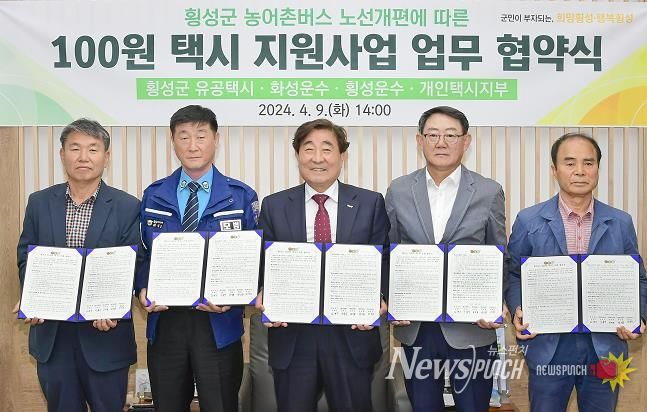 뉴스펀치 김호정 기자 | 횡성군은 주민에게 혁신적이고 저렴한 대중교통 서비스를 제공하기 위해 4월 9일 군청에서 개인택시지부와 유공택시, 화성운수, 횡성운수와 100원 택시 서비스 업무협약을 진행했다.