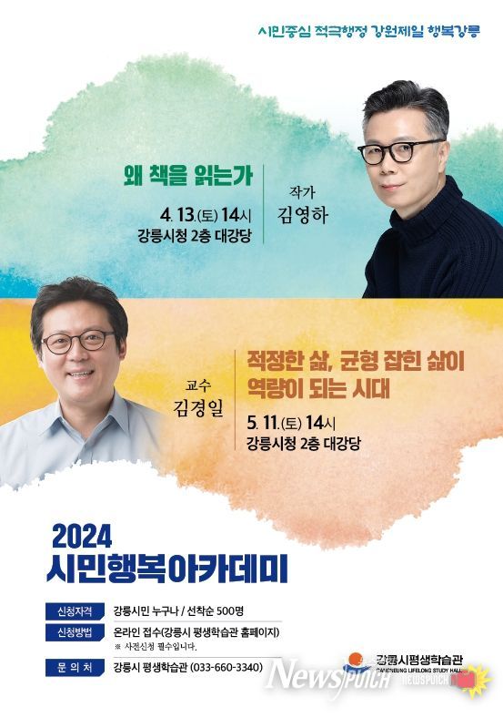 뉴스펀치 김호정 기자 | 강릉시 평생학습관은 강릉시민아카데미의 명칭을 시민행복아카데미로 변경하고, 지난 2023년까지는 일반강사 초청으로 월 4-6회 특강을 진행했으나 2024년부터는 명사들을 초청해 강의를 진행한다.