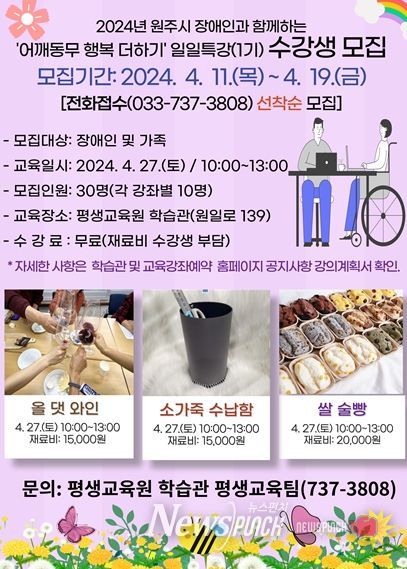 뉴스펀치 김호정 기자 | 평생교육원 학습관은 4월 11일부터 19일까지 장애인 및 가족을 대상으로 장애인과 함께하는‘어깨동무 행복 더하기’일일특강 1기 수강생을 모집한다.