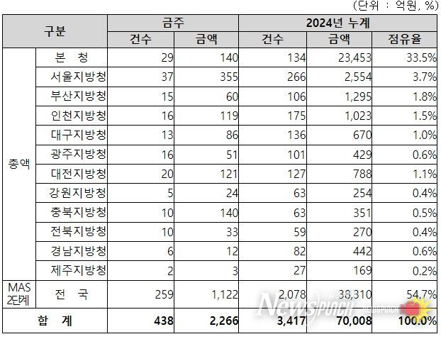 지역별 발주량을 보면, 총액계약 대상 1,144억 원 중 본청이 140억 원으로 12.2%를 집행하고 서울청 등 11개 지방청에서 1,004억 원을 각각 집행할 예정이다.