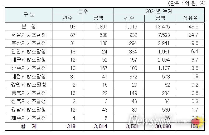 지역별 발주량을 보면 대전광역시 소재 본청 1,867억 원, 서울지방청 538억 원 등 2개청(2,405억 원)이 전체 금액(3,014억 원)의 79.8%를 차지하고 있으며, 인천 등 나머지 10개 지방청 609억 원이 각각 집행될 예정이다.