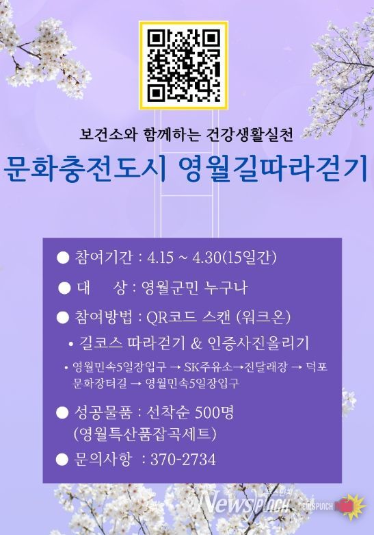뉴스펀치 김호정 기자 | 영월군보건소는 지역사회에 걷기 문화를 활성화하고 영월의 문화도시를 체험할 수 있는 ‘문화충전도시 영월길 챌린지’를 4월 15일부터 30일까지 운영한다.