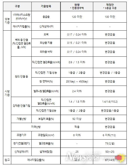 이번 개정안은 신축 공동주택의 에너지 성능을 제로에너지 5등급 수준으로 강화하여 온실가스 감축 및 국민의 에너지 주거비 부담을 완화하고자마련됐다.