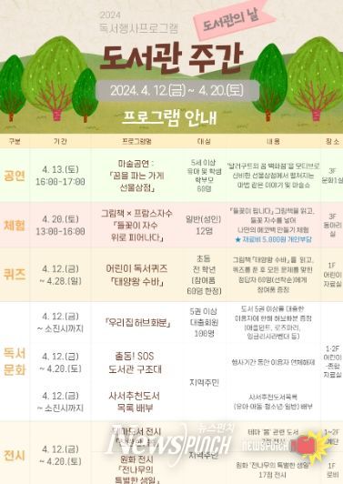 뉴스펀치 김호정 기자 | 정선교육도서관은 오는 4월 12일부터 4월 20일까지 도서관의 날·도서관 주간을 맞이하여 다양한 독서문화프로그램을 운영한다.