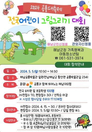 그림그리기 대회 주제는‘쿵쿵! 공룡과 함께 뛰어노는 해남 대모험’으로 참가 대상은 전국의 유치원 및 초등학생이다. 모집 인원은 선착순으로 100명으로, 사전 신청으로 70명, 대회 당일 현장 접수로 30명을 모집한다.