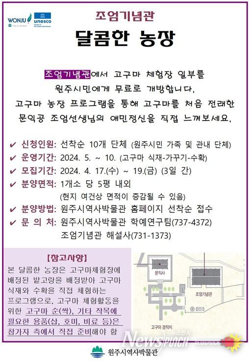 뉴스펀치 김호정 기자 | 원주시역사박물관은 조엄기념관 ‘달콤한 농장’체험프로그램 참가자를 선착순으로 모집한다.
