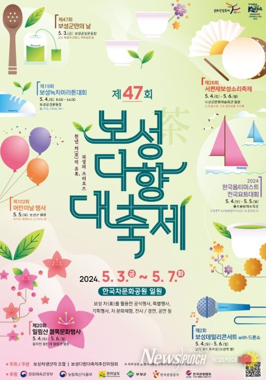 한편, 보성군은 오는 5월 3일부터 7일까지 5일간 한국차문화공원 일원에서 보성다향대축제를 비롯해 △보성군민의날, △서편제보성소리축제, △일림산 철쭉문화행사, △어린이날, △녹차마라톤대회, △전국요트대회, △데일리콘서트, △드론라이트쇼 등 다양한 축제를 개최한다.