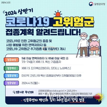 이번 상반기 코로나19 고위험군 추가접종 대상은 코로나19 백신(XBB.1.5. 성분의 화이자, 모더나, 노바백스) 기 접종자 중 5세 이상 면역저하자 및 65세 이상이 대상이며, 추가 접종대상자 외 지난 ’23 ~’24절기 코로나19 백신 미접종자도 접종이 가능하다.