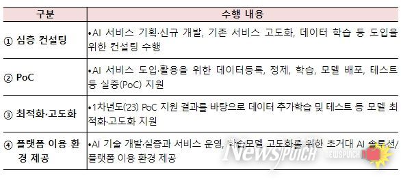 플랫폼 이용지원 분야는 총 27억원 규모로 추진되며 공공·민간의 다양한 기관‧기업에게 초거대AI 플랫폼 활용에 필요한 컨설팅, PoC, 최적화‧고도화, 플랫폼 이용 환경 등을 제공한다. 특히 네이버, KT, 마음AI, 바이브컴퍼니 등 4개 공급기업을 선정했던 작년과 달리 올해에는 공급기업 선정개수에 제한을 두지 않는 등 참여조건을 완화하여 경쟁력을 갖춘 다양한 중소형 기업들도 공급기업으로 참여할 수 있도록 독려할 예정이다.