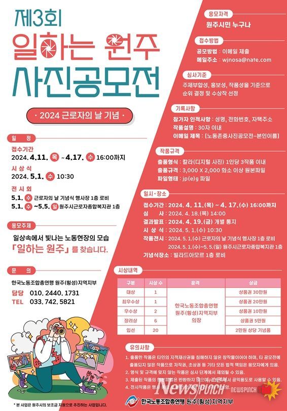 올해 세 번째로 열리는‘일하는 원주’사진전은 시민 누구나 참여 가능한 공모전으로 이메일로 접수받으며, 일상생활 속 다양한 노동현장의 모습을 담은 수상작을 선정하여 입상작품은 기념식 행사장과 근로자종합복지관에서 1차, 2차로 전시한다.