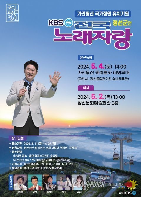 뉴스펀치 김호정 기자 | 가리왕산 케이블카 개장 1주년을 기념하여 전국민의 대잔치 ‘KBS 전국노래자랑 정선군편’이 5.4 오후 2시, 가리왕산케이블카 야외무대에서 개최된다.