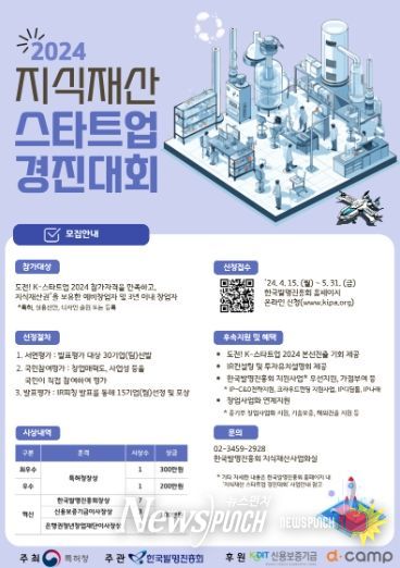 뉴스펀치 장은영 기자 | 특허청은 신용보증기금, 은행권청년창업재단, 한국발명진흥회와 함께 4월 15일부터 5월 31일까지 창의적인 생각(아이디어)과 혁신기술을 가진 창업자의 성장지원을 위해 '2024 지식재산 스타트업 경진대회' 참가기업을 모집한다고 밝혔다.
