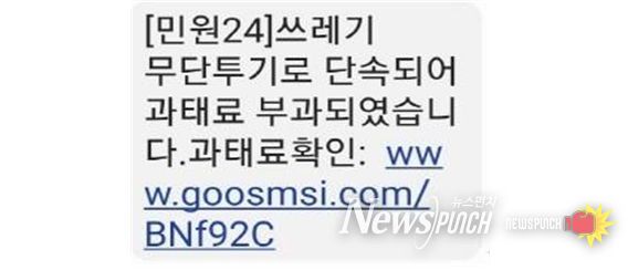 뉴스펀치 김호정 기자 | 원주시는 최근 지자체 및 민원 24를 사칭한 폐기물 무단투기 과태료 스미싱 문자가 퍼지고 있어 주의를 당부했다.