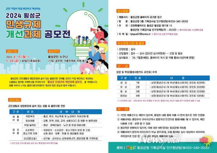 뉴스펀치 김호정 기자 | 횡성군은 기업 및 산업활동을 저해하거나 주민 생활에 불편을 주는 각종 규제에 대해 군민과 기업이 직접 제안하고 개선하는 ‘2024년 횡성군 민생 규제 개선 과제 공모전’을 추진한다.