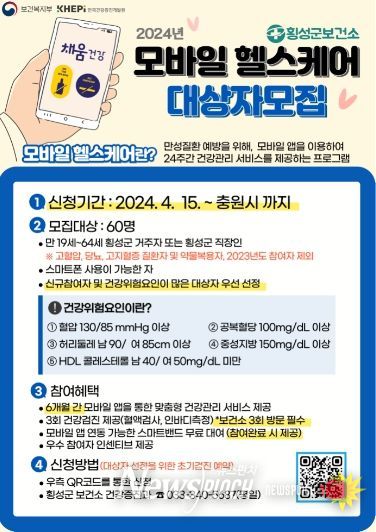 뉴스펀치 김호정 기자 | 횡성군보건소는 ‘2024 모바일 헬스케어’에 참여할 대상자 60명을 모집 중이라고 밝혔다.