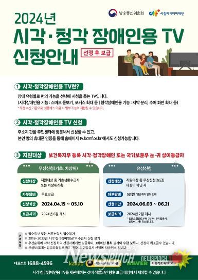 신청 대상은 보건복지부 등록 시각·청각장애인 또는 국가보훈처 등록 눈·귀 상이등급자이며, 신청 기간은 기초생활수급자 및 차상위계층은 무상보급 대상으로 5월 10일까지 신청 가능하고, 차상위초과자(기초생활수급자 및 차상위계층 미해당자)의 경우 유상보급 대상으로 5만원의 자부담금이 발생하며, 6월 3일부터 6월 21일까지 신청 가능하다.