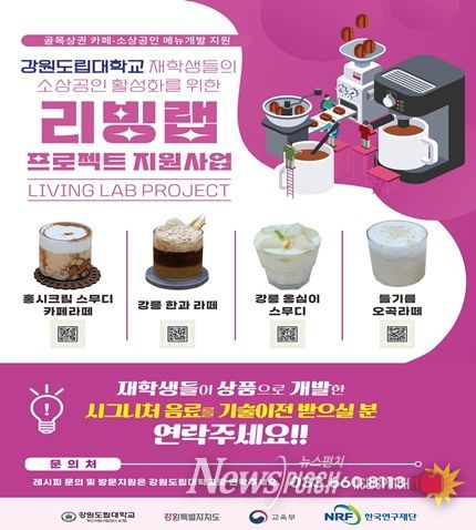 강원특별자치도 18개 시군 지역특화 특산물을 활용하여 만든 시그니처 음료 레시피는 홍시크림 스무디 카페라떼, 강릉한과 라떼, 강릉 옹심이 스무디, 들기름 오곡라떼 등 총 4종으로 도내 지역 소상공인 카페에서 활용할 수 있도록 강원도립대학교 재학생들의 능동적인 참여와 지역의 시너지 확대를 위한 리빙랩 프로젝트로 무상 레시피 기술이전 지원 사업이다.