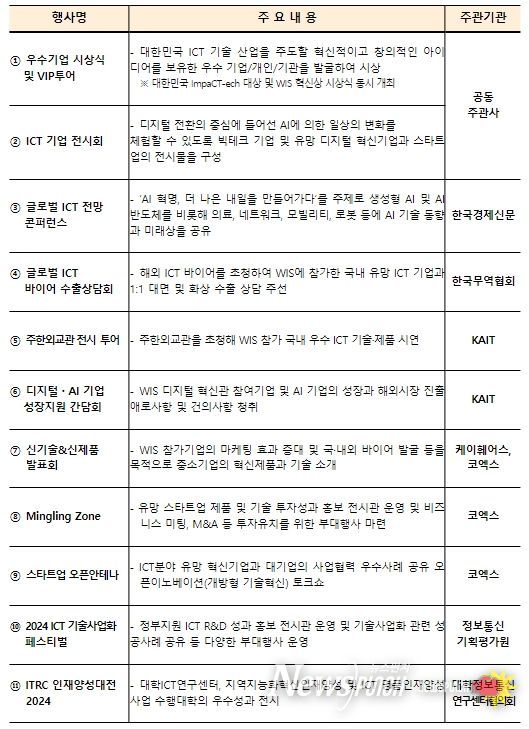월드IT쇼는 정보통신기술 연구개발 성과의 민간 이전을 통해 사업화를 추진하는 ‘2024 ICT 기술사업화 페스티벌’과 ICT 인력양성사업의 우수한 성과를 전시하는 ‘ITRC 인재양성대전 2024’과 동시에 진행하여, 명실공히 ICT 분야 산·학·연을 모두 망라하는 성과를 보고 체험할 수 있는 장이다.