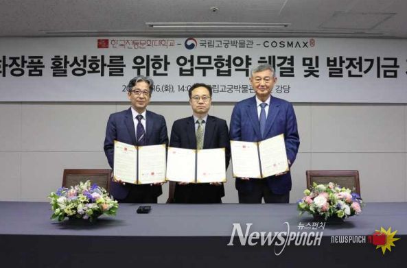 뉴스펀치 김희경 기자 | 문화재청 한국전통문화대학교(총장 강경환)와 국립고궁박물관(관장 정용재)은 지난 16일 국립고궁박물관(서울 종로구)에서 세계적 화장품 연구·개발·생산(ODM) 기업 코스맥스그룹(회장 이경수)과 함께 전통화장품의 연구개발과 이를 활용한 문화 콘텐츠 확산을 위한 업무협약(MOU)을 체결했다.