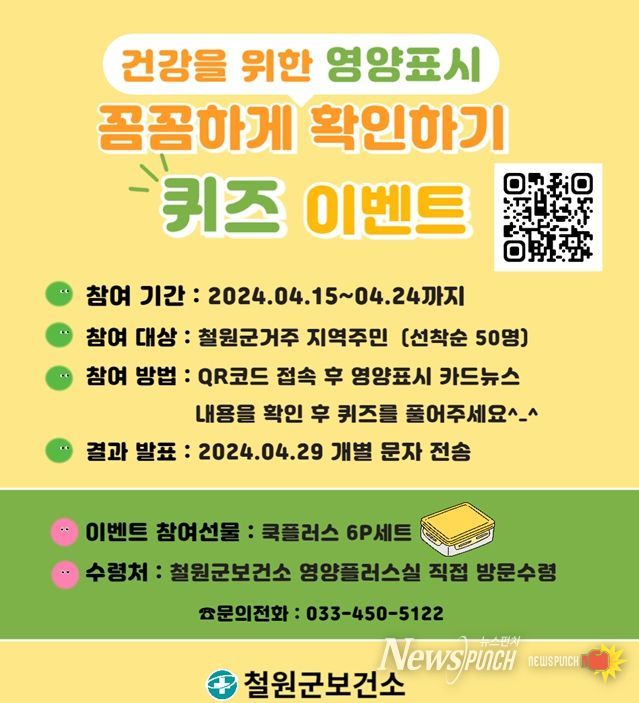 “영양정보표시”를 확인하는 습관은 체중조절, 만성질환 예방과 아동의 성장 발달에 튼튼한 기초를 다지는 역할을 해 철원군보건소는 어렵다고 느끼는 영양표시를 퀴즈로 쉽게 이해하고 활용할 수 있도록 퀴즈 이벤트를 오는 4월 24일까지 진행한다.