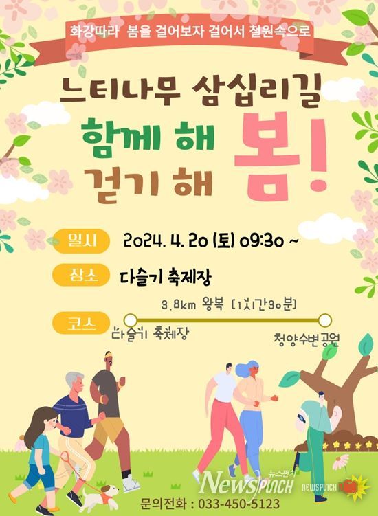 “함께해봄! 걷기해봄!” 행사는 4월 20일 토요일 다슬기축제장에서 열리며 참여를 희망하시는 군민은 행사장으로 오전 9시 30분까지 참석 신청하면 된다.