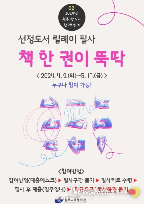 뉴스펀치 김호정 기자 | 강원도교육청 원주교육문화관은 4월 9일부터 5월17일까지 원주 한 도시 한 책 읽기 선정도서 릴레이 필사'책 한 권이 뚝딱!'을 운영한다.
