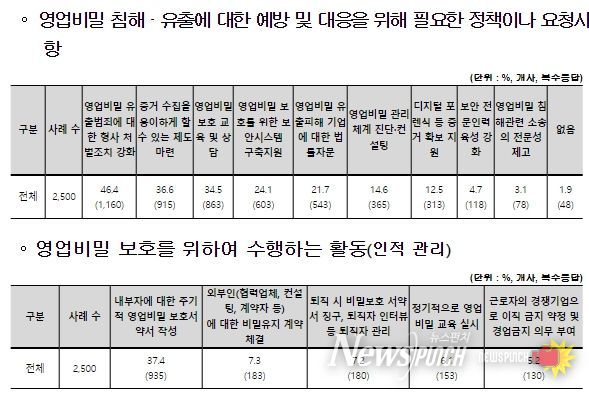 영업비밀 보호를 위하여 수행하는 활동은 '내부자에 대한 주기적 영업비밀 보호서약서 작성'(37.4%)이 가장 많았고, ‘외부인에 대한 비밀유지 계약 체결’(7.3%), ‘경쟁기업으로 이직 금지 약정 및 경업금지 의무 부여’(5.2%) 순이었다.