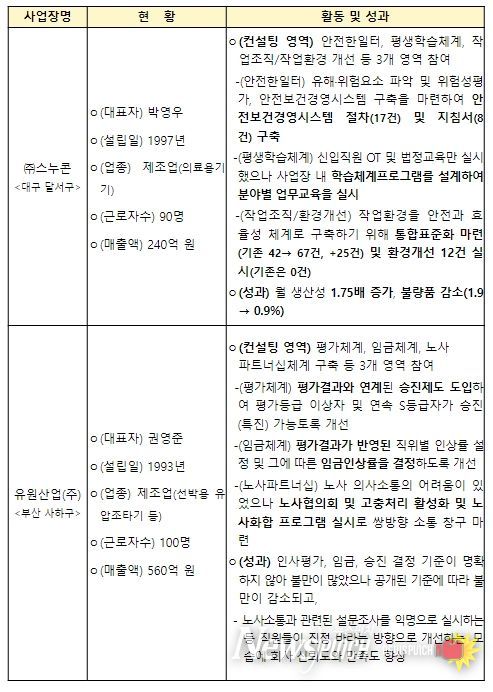 박수경 스누콘 이사는 “기존에는 업무 프로세스가 체계화되지 않아 임기응변식으로 대응하다 보니 직원들의 불만이 많았고 관리하는 입장에서도 어려웠다.”라고 하면서, “중소기업 입장에서는 비용을 들여 개선하기가 쉽지 않았는데 일터혁신 컨설팅으로 업무체계 구축에 큰 도움이 되어 노사가 모두 만족하고 있다.”라고 밝혔다.
