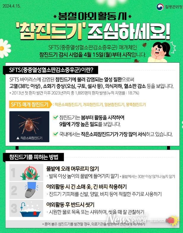 뉴스펀치 김호정 기자 | 홍천군보건소는 최근 진드기매개 감염병인 중증열성혈소판감소증후군(SFTS) 감염 위험이 높은 계절이 다가옴에 따라 주요 매개체인 참진드기 예방에 각별한 주의를 당부했다.