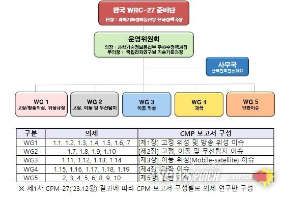 이번에 발족한 한국 WRC-27 준비단은 과기정통부를 중심으로 산업계, 학계, 연구계 및 관련 부처(국방부, 국토부, 해수부 등) 관계자 약 60여명(30여개 기관)으로 구성되며, WRC-27 주요 의제 분석과 연구 활동 등을 통해 국제회의에서 국내 전파자원을 확보‧보호하고, 관련 기술의 국제 표준화를 지원하는 것을 목적으로 한다.