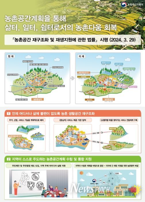 뉴스펀치 장은영 기자 | 농림축산식품부는 농촌소멸 위기와 난개발 등에 대응하고, 삶터·일터·쉼터로서의 농촌 기능 재생을 위한 ‘농촌공간 재구조화 및 재생 기본방침’을 발표했다.