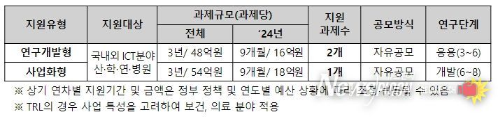 국내외 의료데이터 확보 및 개발되는 의료AI·디지털치료기기의 신뢰성, 유효성 및 안정성 검증을 위해 많은 비용과 시간이 필요한 의료분야의 특수성을 고려하여, 연구개발형은 연간 16억원 이내, 사업화형은 연간 18억원 이내 규모로 최대 3년 동안 지원할 예정이다.