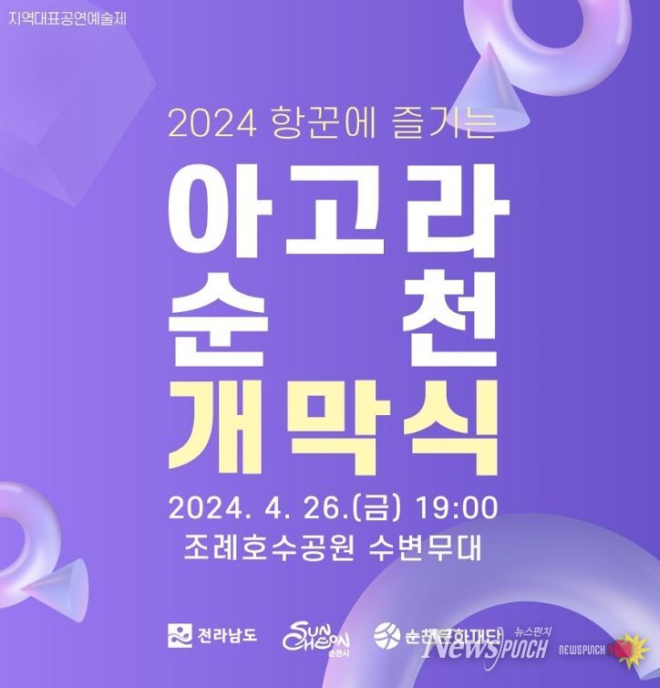 뉴스펀치 김희경 기자 | 순천문화재단은 오는 26일 오후 7시 조례호수공원 수변무대에서‘2024 항꾼에 즐기는 아고라 순천’개막식을 개최한다고 밝혔다.